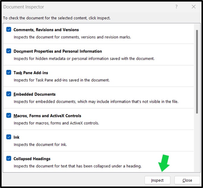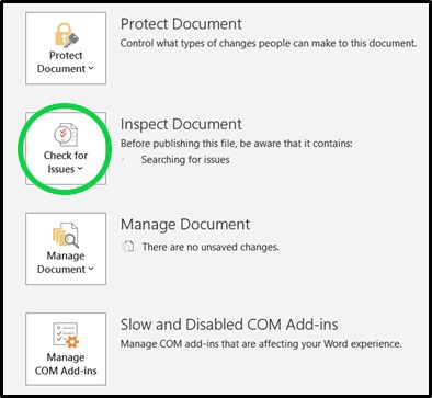 Next, click the Check for Issues dropdown, and then select Inspect Document.